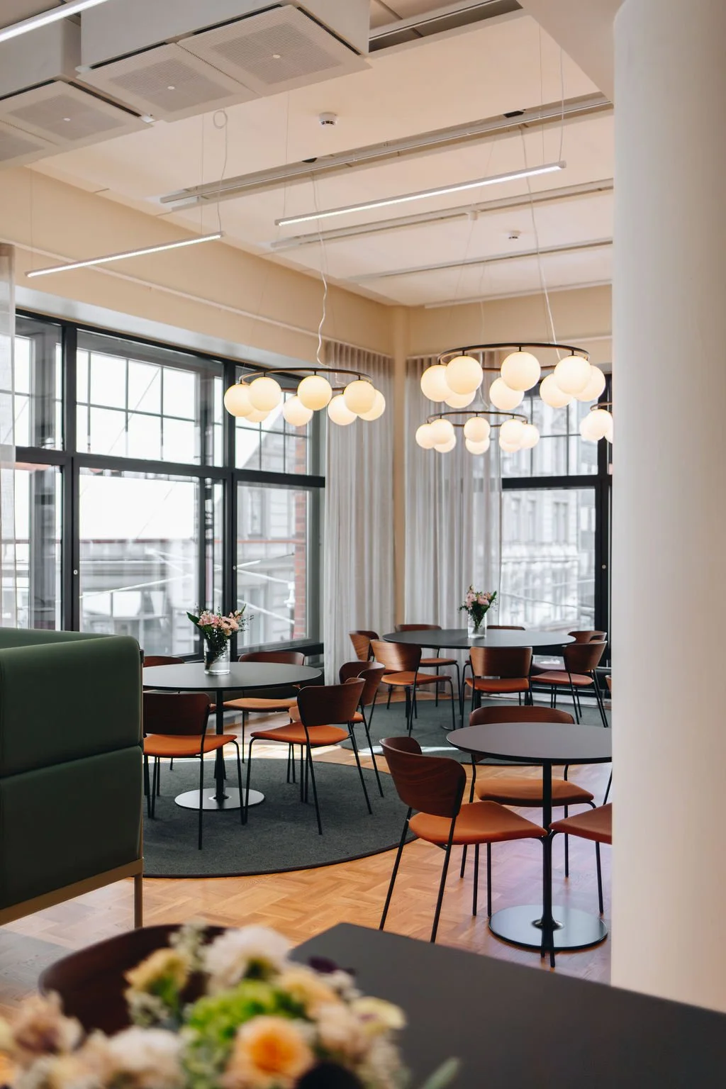 Visuaalisen ilmeen lähtökohtana oli kunnioittaa upean rakennuksen historiaa ja uudistettua ulkoasua. Samalla haluttiin toteuttaa asiakkaan tavoitteiden mukaiset modernit tilat, jotka ovat sekä toimivat että viihtyisät. Lattiamateriaaleina käytettiin kaunista tammiparkettia sekä kokolattiamattoa. Tilojen ylevä interiööri ja suuret ikkunat haluttiin pitää suunnittelun keskiössä. Sisustussuunnittelun värisävyiksi valikoitui pääosin beigen, ruskean, terrakotan ja vihreän eri sävyt. Working cafen keittiön sävyksi valittiin upea burgundi. Kauniit sisustusvalaisimet löytyivät Nude Concept:n valikoimista.